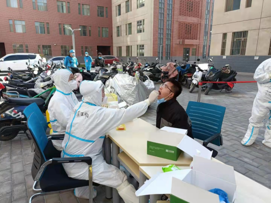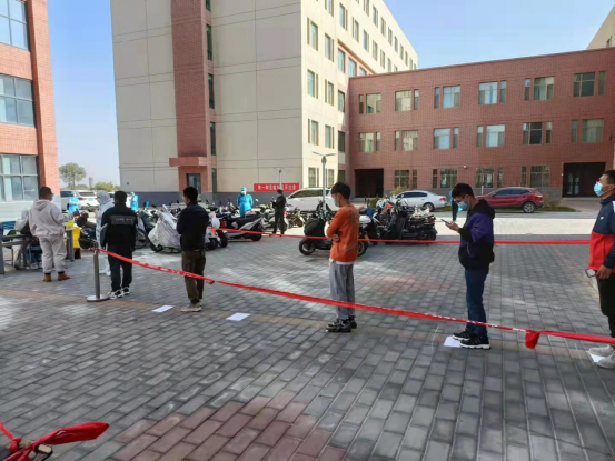 在现场,为响应张掖市第三次全民核酸检测工作,缓解社区防疫压力,也为保证核酸检测工作的顺利进行,公司提前在公寓门前的空旷区域布置了检测点,设立员工进出通道,并提前做好消杀工作。公司在各个楼层安排员工党员先锋岗,组织检测员工有序排队下楼,同时,在每个区域安排员工党员协助医护人员完成取样工作并维持现场秩序。等候检测期间,公司员工党员提醒员工戴好口罩,并指引员工自觉按地标保持一米间隔排队,在规定时间内完成了检测。在完成核酸检测后,组织员工从检测点右侧的公寓西侧疏散门离开,由西侧楼梯返回宿舍,有效的防止了交叉感染。